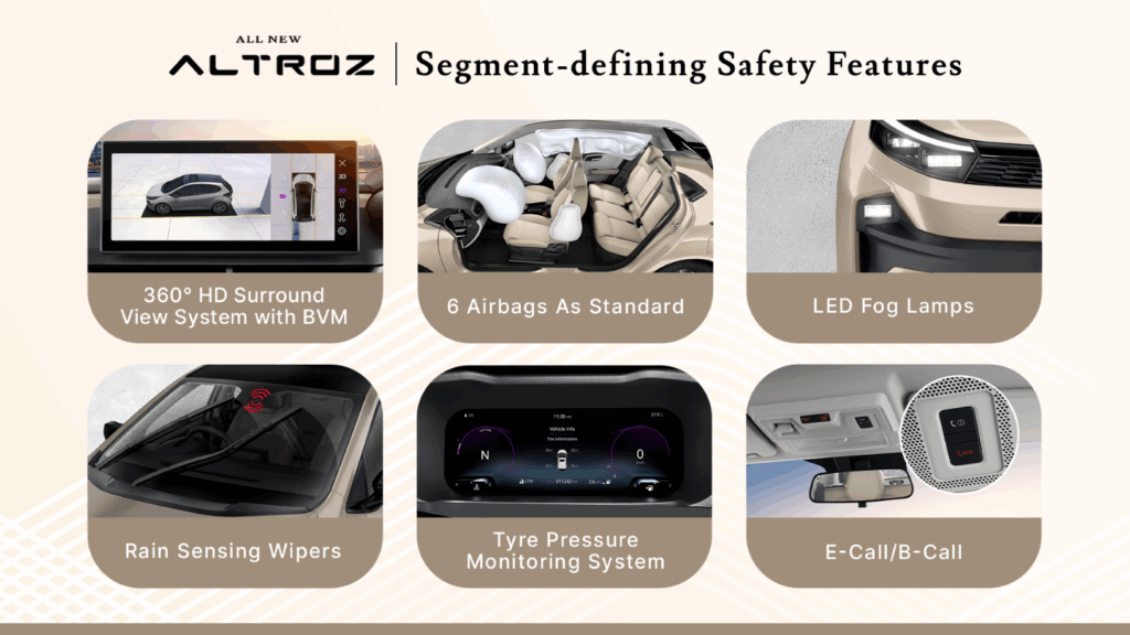 Launched in May 2025, the All-New Altroz continues its legacy of safety and trust. Built on Tata Motors’ proven ALFA (Agile Light Flexible Advanced) architecture, the Altroz with its Diamond Strength Safety Shield ensures enhanced structural rigidity with reinforced crumple zones, setting new benchmarks in occupant protection. India’s safest hatchback is equipped with a robust safety suite that includes six airbags, Electronic Stability Program (ESP), and ISOFIX child seat restraints as standard across all personas, coupled with a 360° HD Surround View Camera with Blind View Monitor, Direct TPMS, SOS and Breakdown assistance, Auto Headlamps, Rain-Sensing Wipers, and LED Fog Lamps with cornering function—delivering all-round protection and complete peace of mind on every drive.