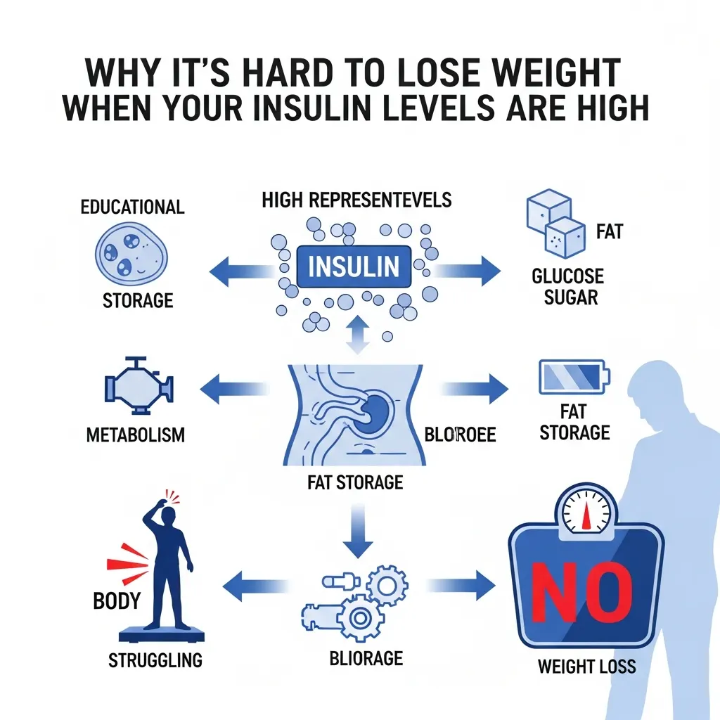 If you have high insulin levels, losing weight is very hard, if not impossible.It’s like trying to get water out of a boat while someone else is continuously putting water in. You might get a little better, but it’s going to be hard.